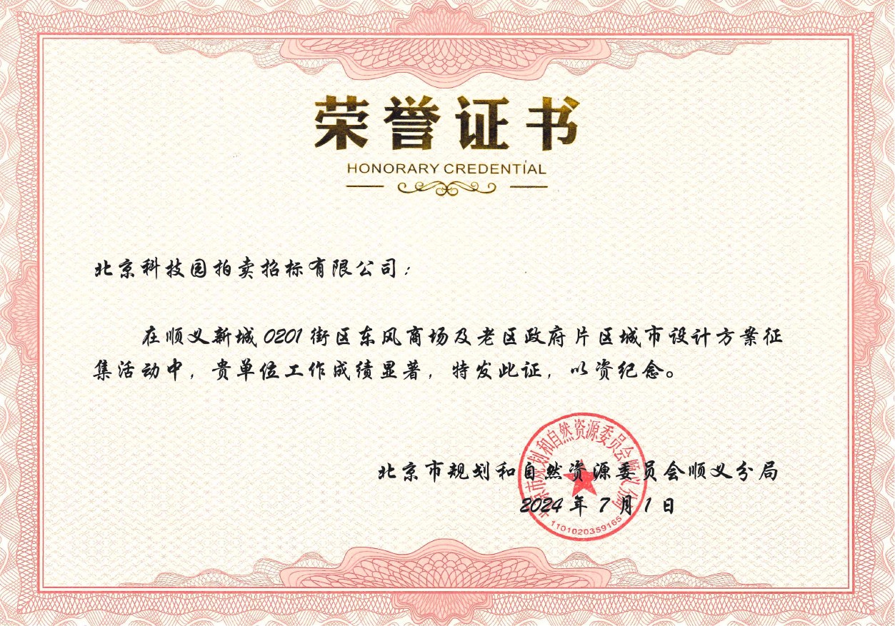 順義新城 0201街區(qū)東風(fēng)商場(chǎng)及老區(qū)政府片區(qū)城市設(shè)計(jì)方案征集榮譽(yù)證書(shū)