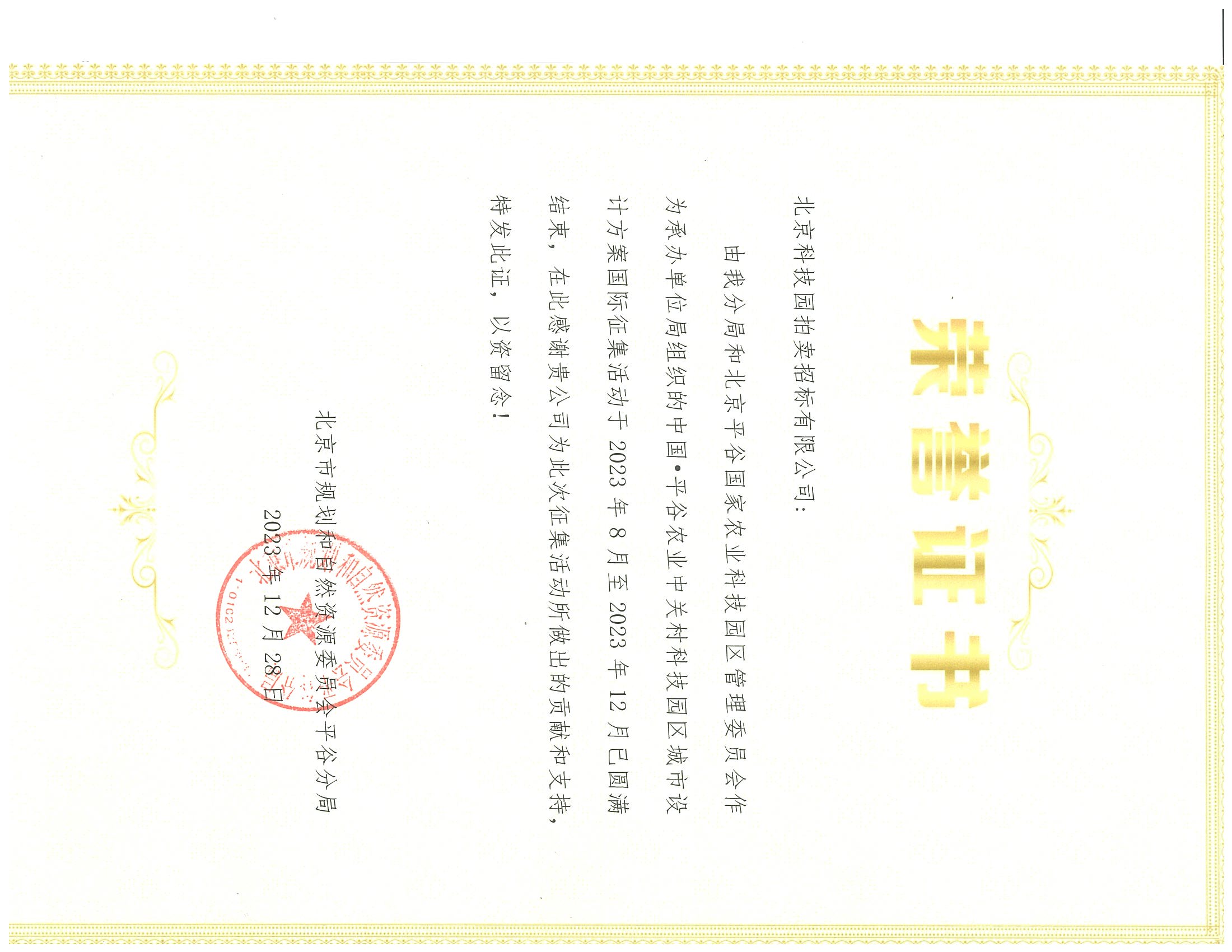 中國(guó)·平谷農(nóng)業(yè)中關(guān)村科技園區(qū)城市設(shè)計(jì)方案國(guó)際征集榮譽(yù)證書(shū)