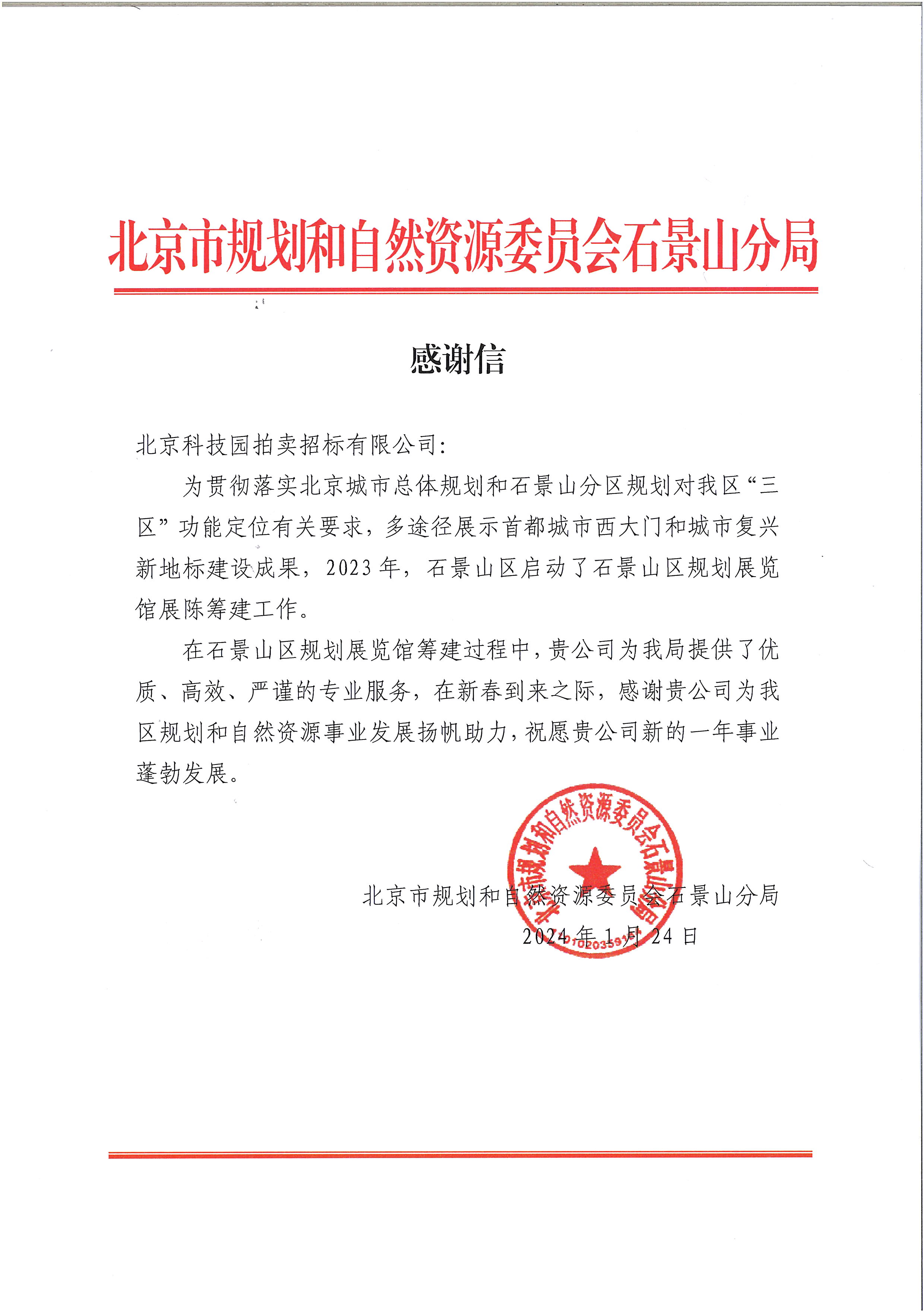 北京市規(guī)劃和自然資源委員會(huì)石景山分局感謝信