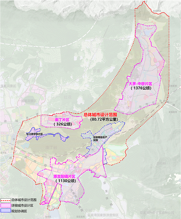 詳細城市設(shè)計包括3個片區(qū),總面積約2832公頃。其中,原吉陽鎮(zhèn)片區(qū)面積約1130公頃,南丁片區(qū)約326公頃,大茅-中廖片區(qū)約1376公頃(詳見規(guī)劃范圍示意圖)。